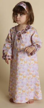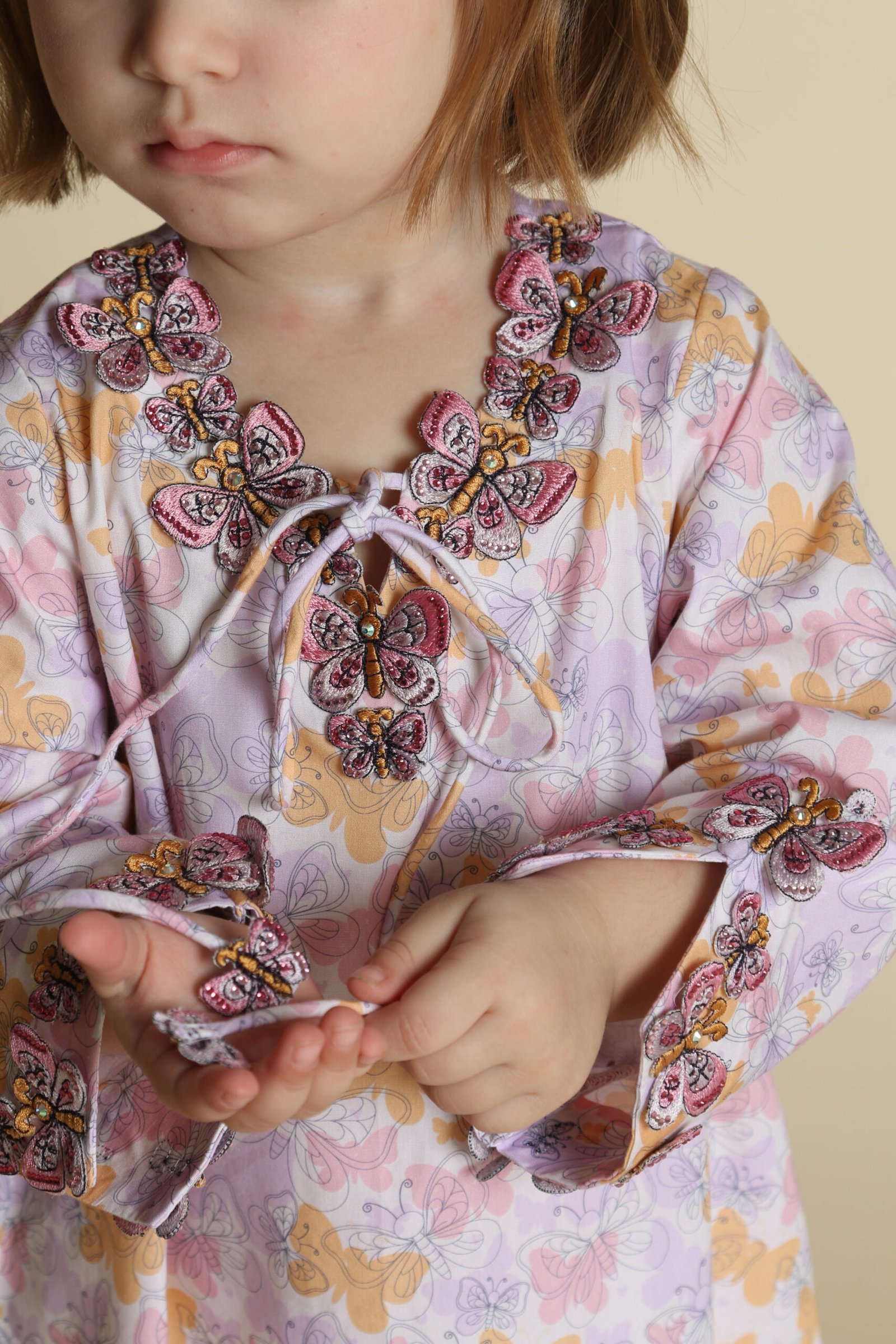 جلابية مصنوعة من أجود أنواع القطن، مزينة بفراشات مرصّعة بالكريستال، وتشمل ربطة شعر.