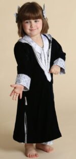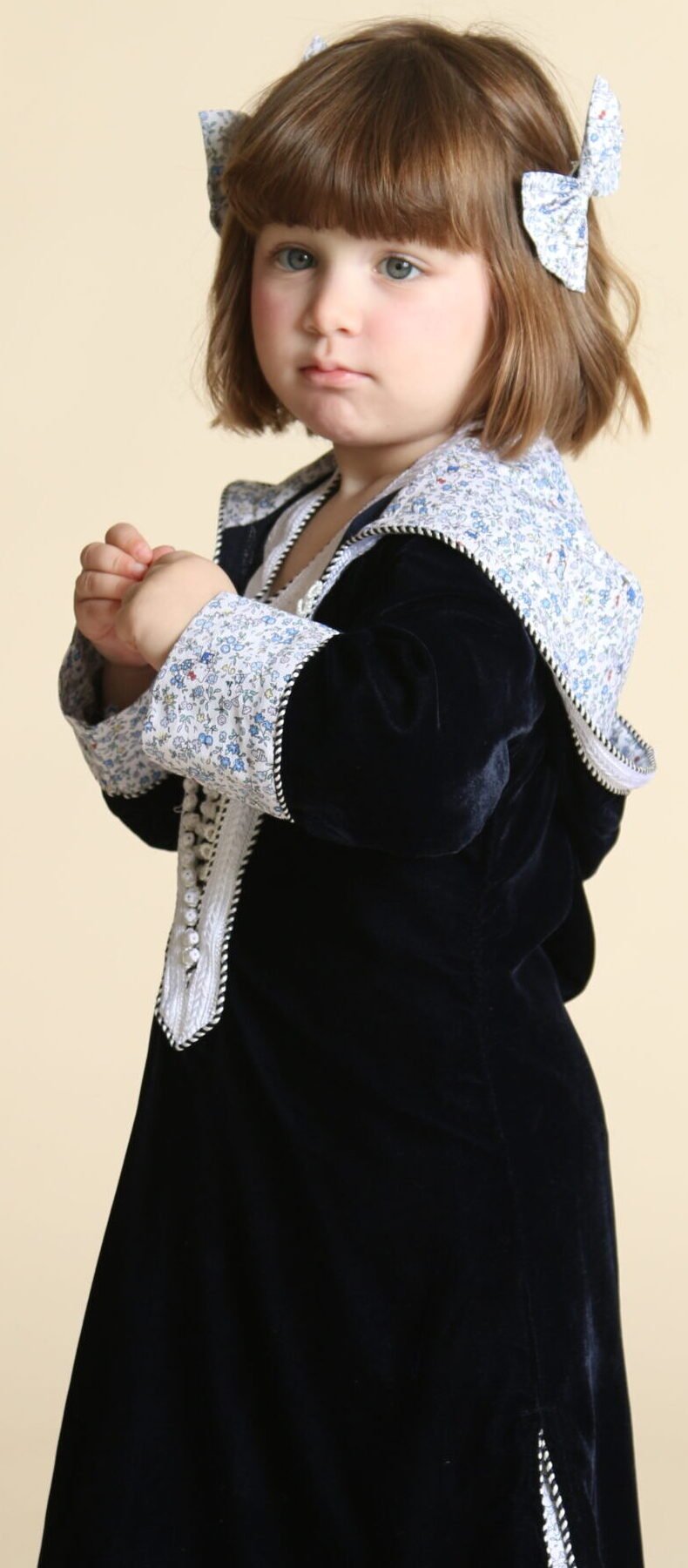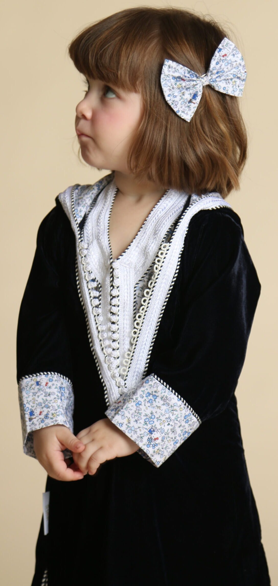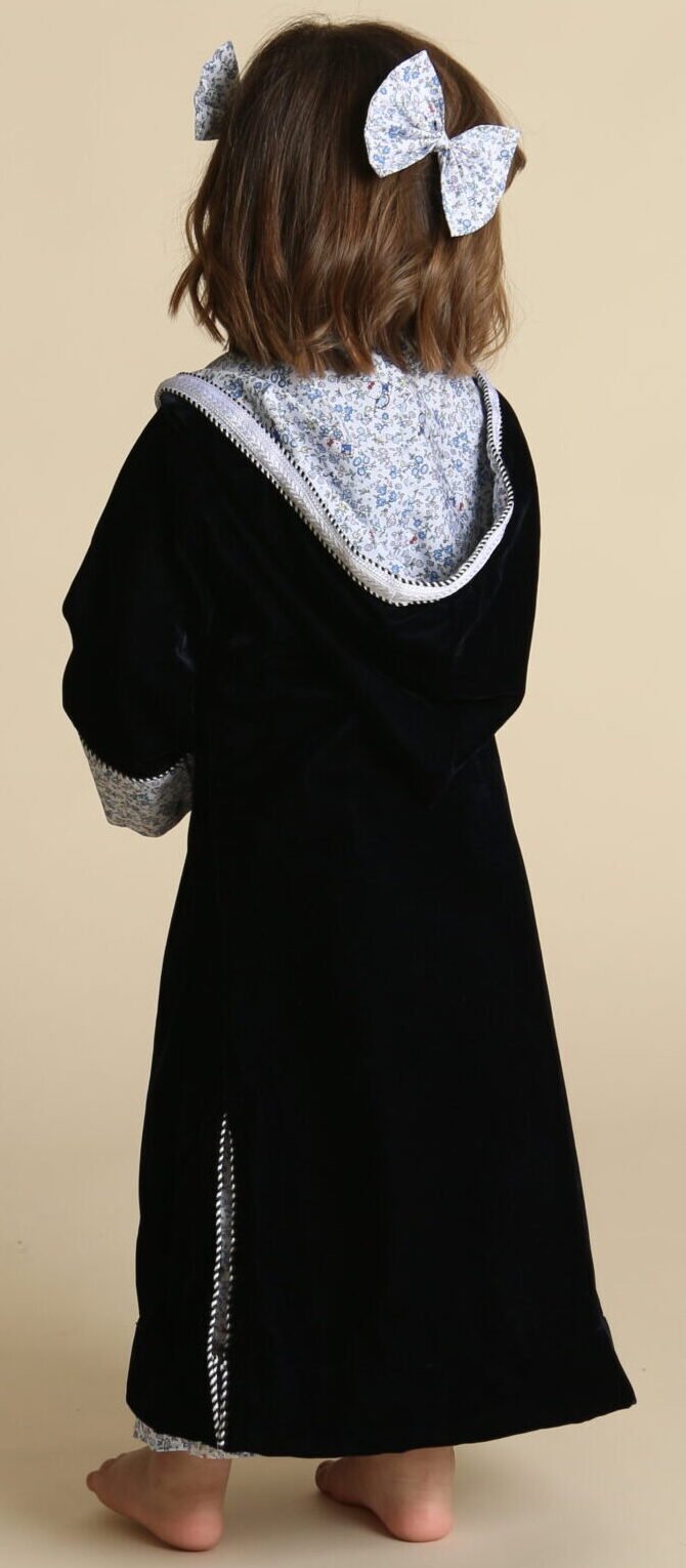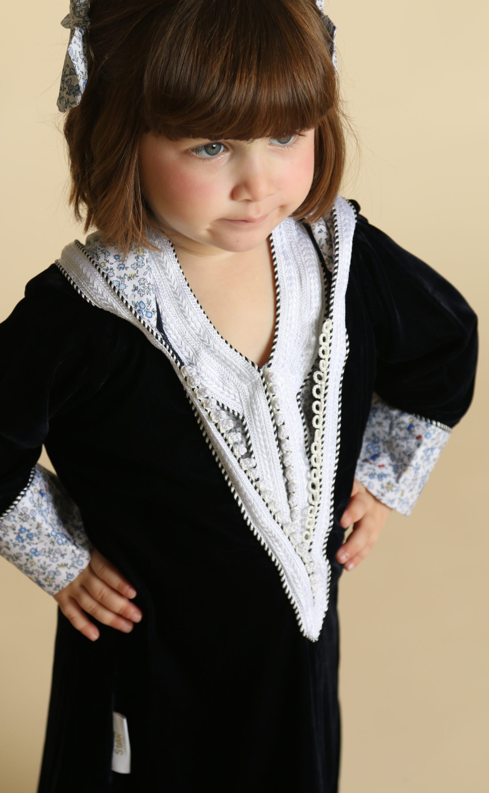 جلابية مغربية مكوّنة من قطعتين، مصنوعة من المخمل الفاخر مع قماش لِبرتي الناعم والخيوط المصنوعه يدوياً.
