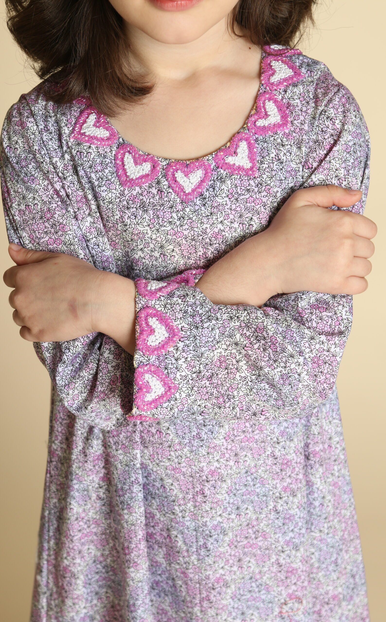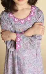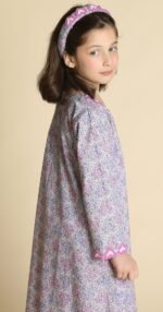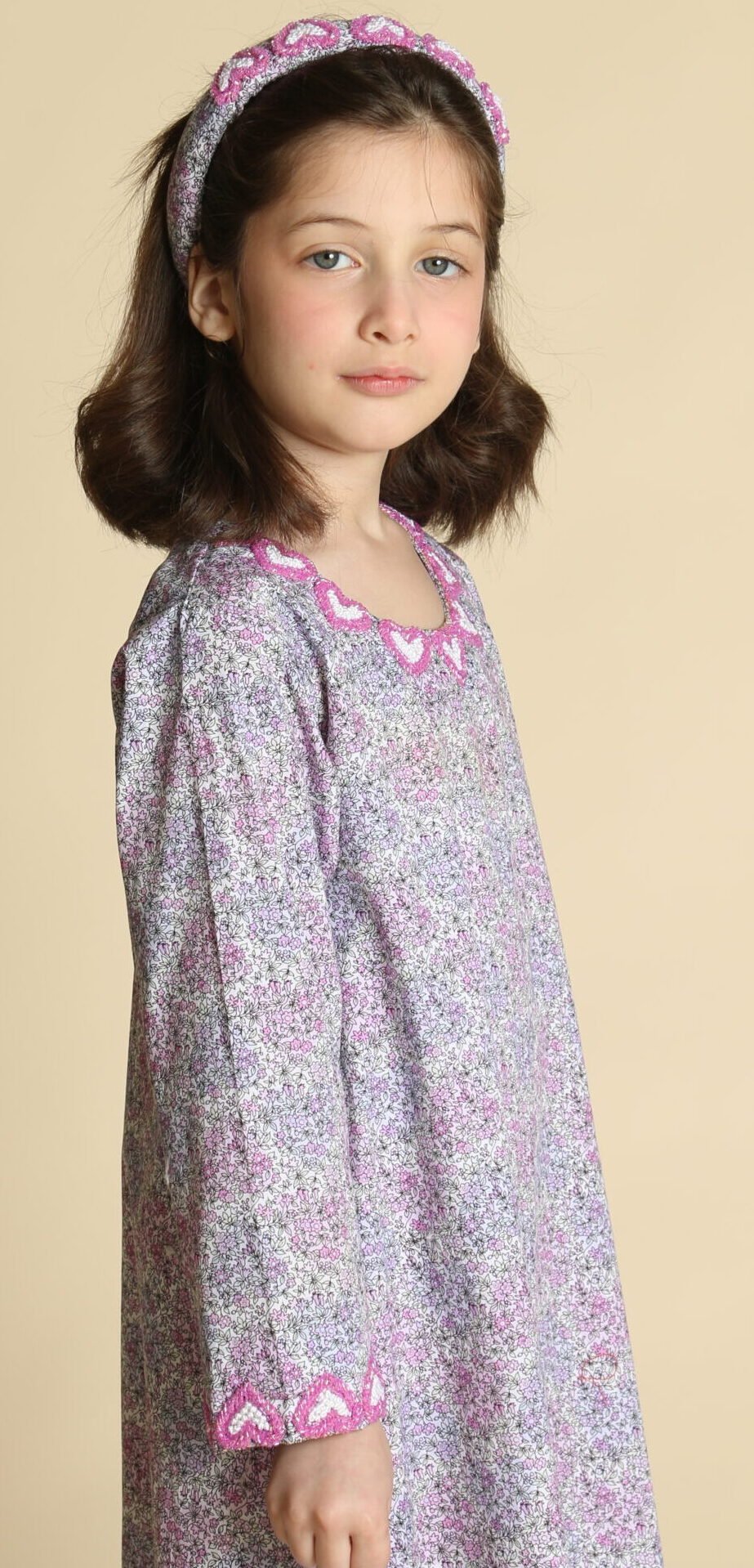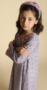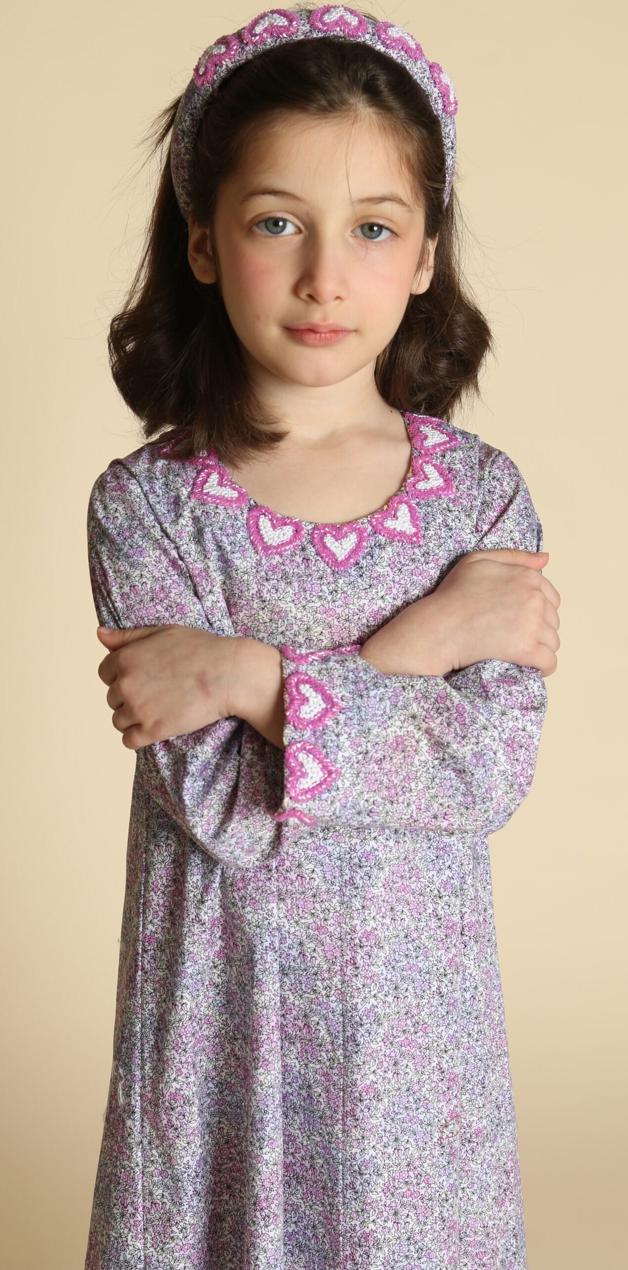 جلابية مصنوعة من أجود أنواع القطن، مزينة بفراشات مرصّعة بالكريستال، وتشمل ربطة شعر.