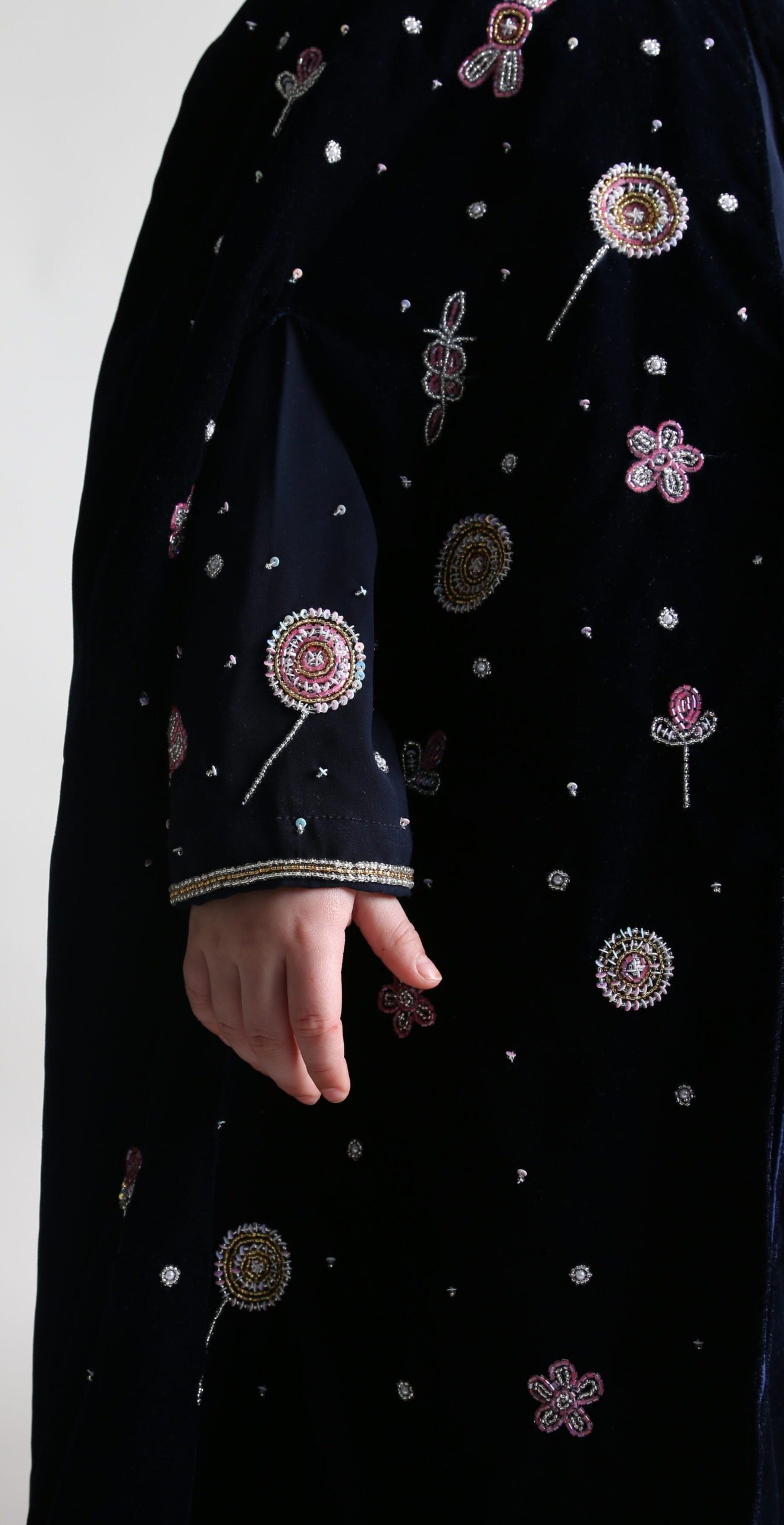 جلابية مغربية مكوّنة من قطعتين، مصنوعة من المخمل الفاخر مع قماش لِبرتي الناعم والخيوط المصنوعه يدوياً.