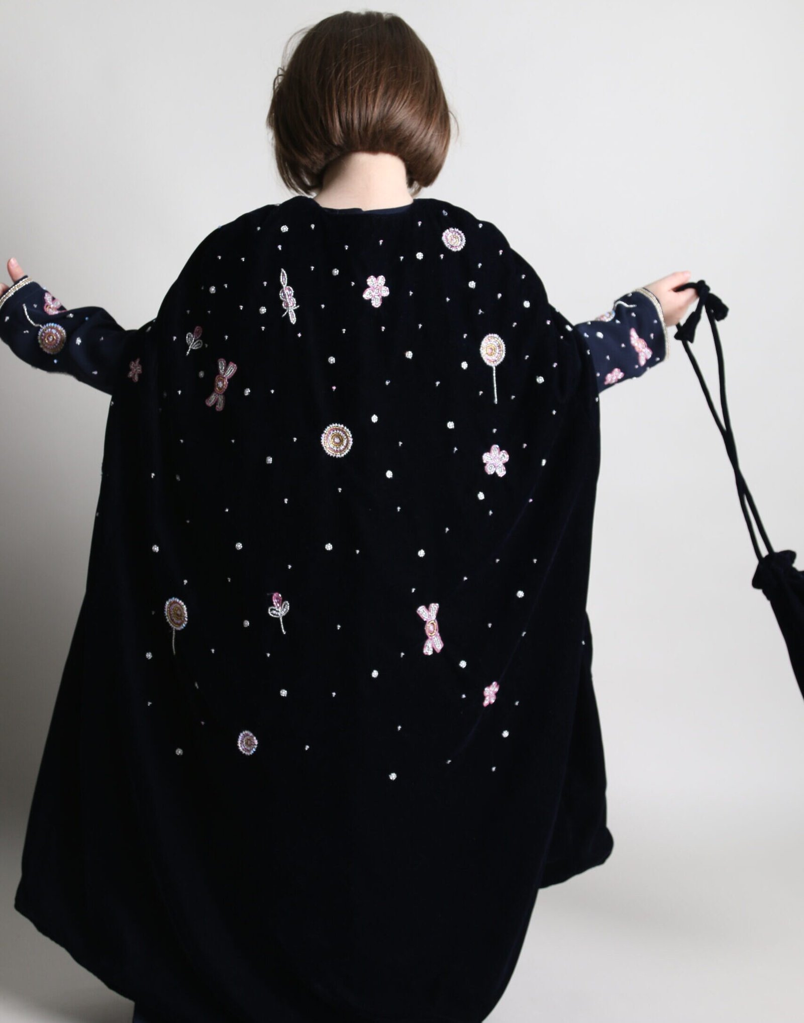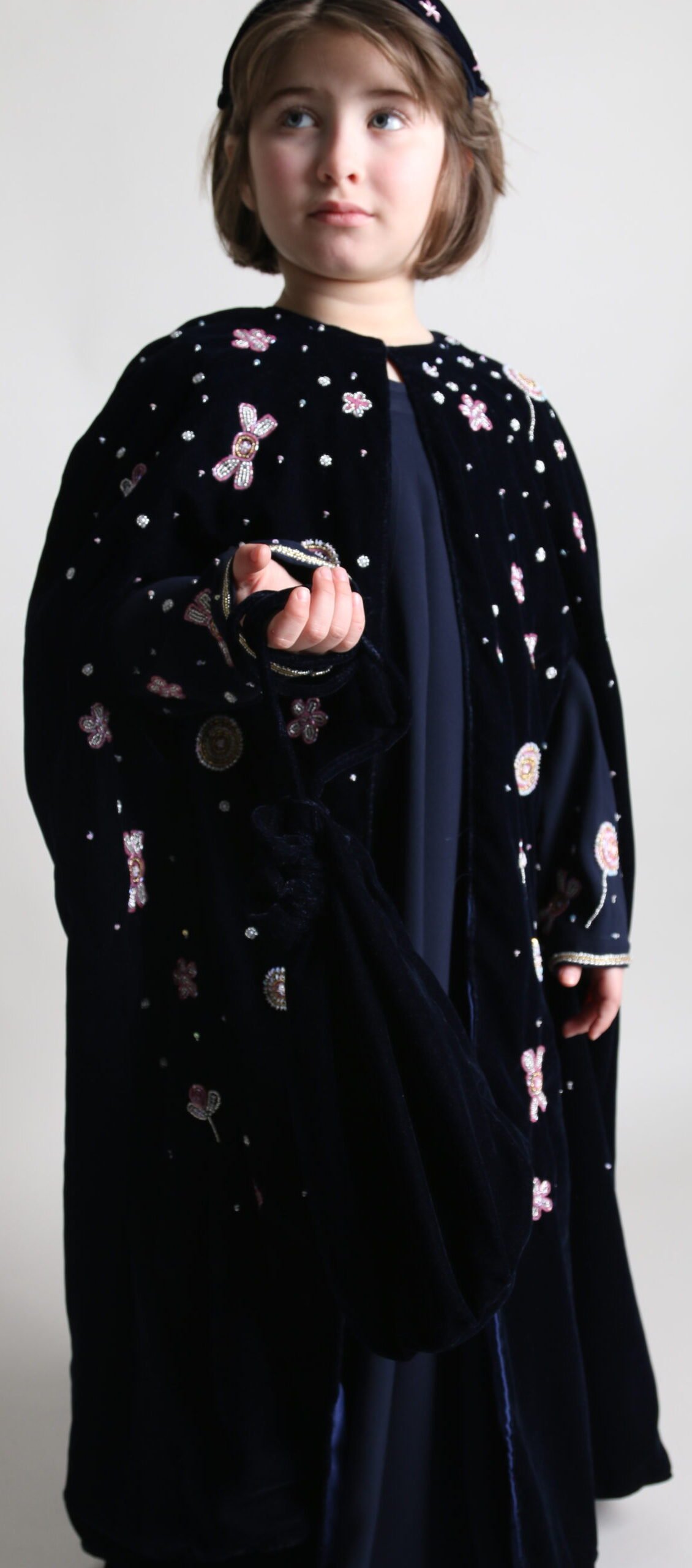 جلابية مصنوعة من أجود أنواع القطن، مزينة بفراشات مرصّعة بالكريستال، وتشمل ربطة شعر.
